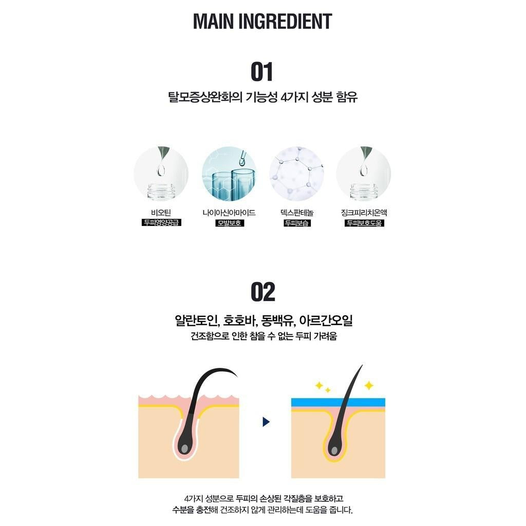Purified water, communication cocoyl glutamate, cocamidopropyl betaine, sodium chloride, cocamide DEA, glycerin zinc pyrithione solution (50%), dexpanthenol. Polyquaternium-10, Niacinamide, Jojoba Seed Oh! Sun Camellia Seed Oil, Argan Kernel Oil, Biotin, Disodium EDTA, Allantoin, Hydrolyzed Keratin, Hydrolyzed Silk, Hydrolyzed Droplagen Propylene Glycol, Tocopheryl Acetate, Green Tea Extract, ethyl hexyl glycerin. Ginseng Extract, Lobular Leaf Extract, Dipropylene Glycol, Mildew Wheat Extract, Orchid Root Extract, H. Root Extract, Ojuk Leaf Extract, Nettle Extract, Incarnata fenugreek extract, Centella asiatica extract, Purslane purslane extract, Angelica asiatica root extract, Jokdori Grass Root Extract, Thief's Wand Beak Extract, Mosquito Tree Leaf Extract. Goji berry extract, ginkgo leaf extract, safflower flower extract. Lavender Flower Extract, Bergamot Leaf Extract, Peppermint Leaf Extract, Freesia Extract, Matricaria Flower Extract, Rosemary Leaf | Extract, Butylene Glycol, Sodium Hyaluronate, Copper Tripeptide-1, Alginic, Magnesium Chloride, Mantle, Caravel. Textrin, phenoxyethane, PEG-2 phenyl ether, 1,2-hexanediol, fragrance, limonene