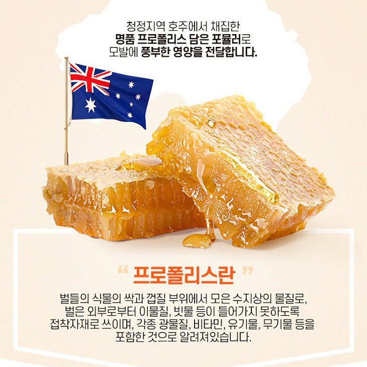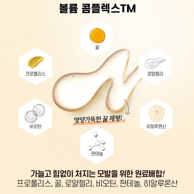 Purified water, cocamidopropyl betaine, sodium laureth sulfate, coco-glucoside, propolis extract (20 ppm), honey extract, royal pelli extract, panthenol, sodium hyaluronate, biotin, polyquaternium-7, glyceryl Oleate, sodium laureth-6 carboxylate, PEG-cross polymer, PG-3 caprylyl ether, polysorbate 20, PEG-150 pentaerythrityl tetrastearate, PEG-6 caprylic /Capric Glycerase, PEG-40 Hydrogenated Castor Oil, Tetrasodium EDITA, Butylene Glycol, Hexylene Glycol, Sodium Chloride, Sodium Citrate, Citric Acid, 1,2-hexanedi All, Ethanol, Sodium Benzoate, Yellow No. 4, Yellow No. 5, Fragrance