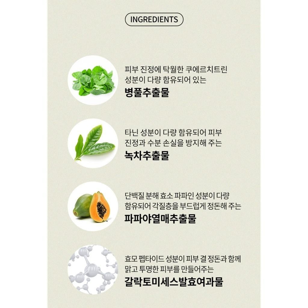 Purified water, methylpropanediol, mugwort leaf extract (20,000ppm), glycerin, polyglyceryl-10 laurate, polyglyceryl-4 laurate, caprylyl/capryl glucoside, glycereth-26, 1,2-hexane Diol, propanediol, caprylyl glycol, star anise extract, gluconic acid, arginine, carbomer, ethylhexyl glycerin, wild strawberry extract, low sweet blueberry extract, raspberry extract, acai palm fruit extract, licorice Root extract, persimmon leaf extract, mulberry bark extract, cochineal cactus fruit extract, butylene glycol, broccoli extract, alfalfa extract, cabbage extract, wheat germ extract, rapeseed extract, radish seed extract, barley seed extract, wheat extract, corn Kernel extract, mung bean extract, black bean extract, rice bran extract, common jasmine flower/leaf extract, rosemary leaf extract, lavender flower/leaf/stem extract, virginia bark/leaf/twig extract, eucalyptus leaf extract, port marigold flower extract, Peppermint leaf extract, Verbena extract, Matricaria flower extract, Rooibos extract, Centella asiatica extract, Green tea extract, Galactomyces ferment filtrate, Cypress leaf extract, Pine leaf extract, Old juniper sprout extract, Papaya fruit extract, Bergamot bark oil, Limonene, Disodium EDI, etc.