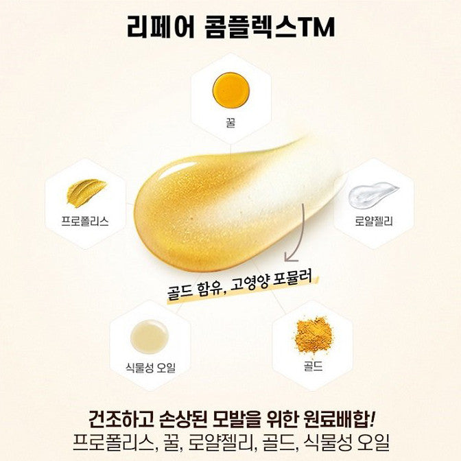 Purified water, sodium laureth sulfate, cocamidopropyl betaine, ammonium lauryl sulfate, dimethicone, hexylene glycol, propolis extract (20ppm), honey extract, royal jelly extract, drumstick seed oil, argan kernel oil , gold, polyquaternium-10, polyquaternium-73, guarhydroxypropyltrimonium chloride, PEG-crosspolymer, acrylate/C10-30 alkyl acrylate crosspolymer, disodium cocoamphodiacetate, PG -3 Caprylyl Ether, Caprylyl Glycol, Caramel, Triethanolamine, PEG-40 Hydrogenated Castor Oil, TEA-Cocoyl Glutamate, Synthetic Fluorphlogopite, Laureth-23, Disodium EDTA, tetrasodium EDTA, laureth-4, titanium dioxide (CI 77891), citric acid, red iron oxide, polysorbate 20, tin oxide, butylene glycol, sodium chloride, sodium citrate, 1 ,2-hexanediol, ethanol, sodium benzoate, phenoxyethanol, fragrance, limonene