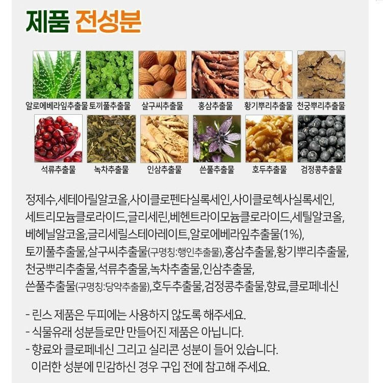Purified water, cetearyl alcohol, cyclopentasiloxane, cyclohexasiloxane, cetrimonium chloride, glycerin, behentrimonium chloride, cetyl alcohol, behenyl alcohol, glyceryl stearate, aloe vera leaf extract (1%), Shamrock extract, apricot seed extract (old name: passerine extract), red ginseng extract, astragalus root extract, chrysanthemum root extract, pomegranate extract, green tea extract, ginseng extract, bitter grass extract (old name: sugar extract), walnut extract, black bean extract, fragrance, clofenesin