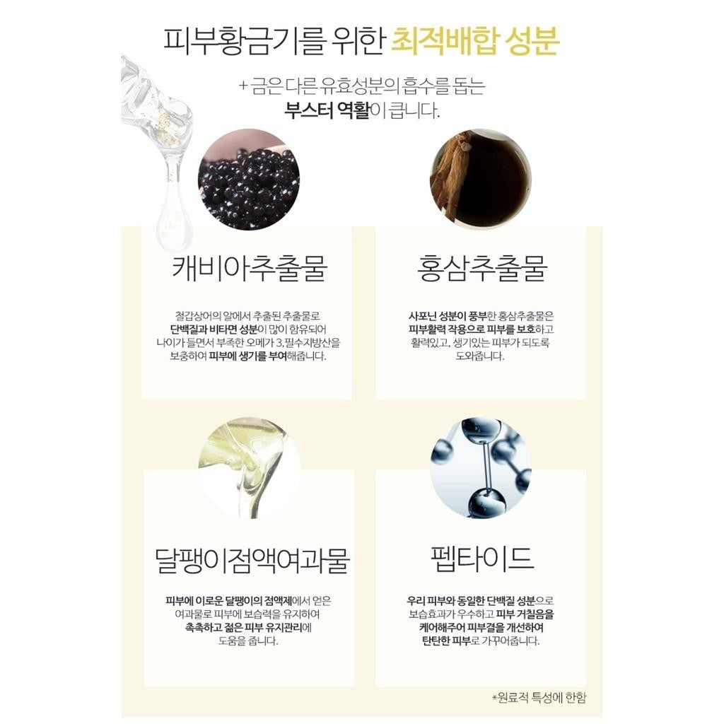 Aloe leaf extract, green tea extract, broccoli extract, centella asiatica extract, caviar extract, marigold extract, sodium hyaluronate hydrolyzed collagen, red ginseng extract, gold (24K), niacinamide single wire flower/stem extract, lotus extract, cabbage extract, carbomer , snail mucus filtrate, allantoin, panthenol, 1,2-hexanediol, propanediol, SH-octapeptide-4, nicotinoylhexapeptide-44. SH-pentapeptide-2 SH-oligopeptide-1, SH-polypeptide-1, SH-polypeptide-11, SH-oligopeptide-2 H-polypeptide-3, SH-polypeptide-22 RH-oligopeptide-2, adenosine , Ubiquinone, Tocopherol