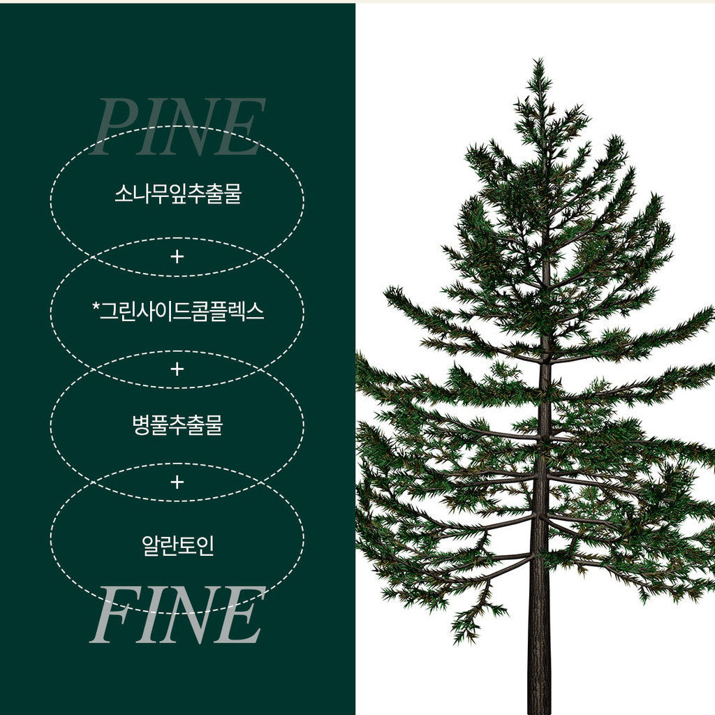 Pine leaf extract (81.0%), butylene glycol, purified water, niacinamide, 1,2-hexanediol, panthenol, polyglyceryl-10 laurate, polyglyceryl-10 myristate, glycerin, allantoin, polyquat Nium-51, ethylhexylglycerin, xanthan gum, caprylyl glycol, adenosine, disodium EDTA, centella asiatica extract, sodium hyaluronate, cypress leaf extract, tea tree leaf extract