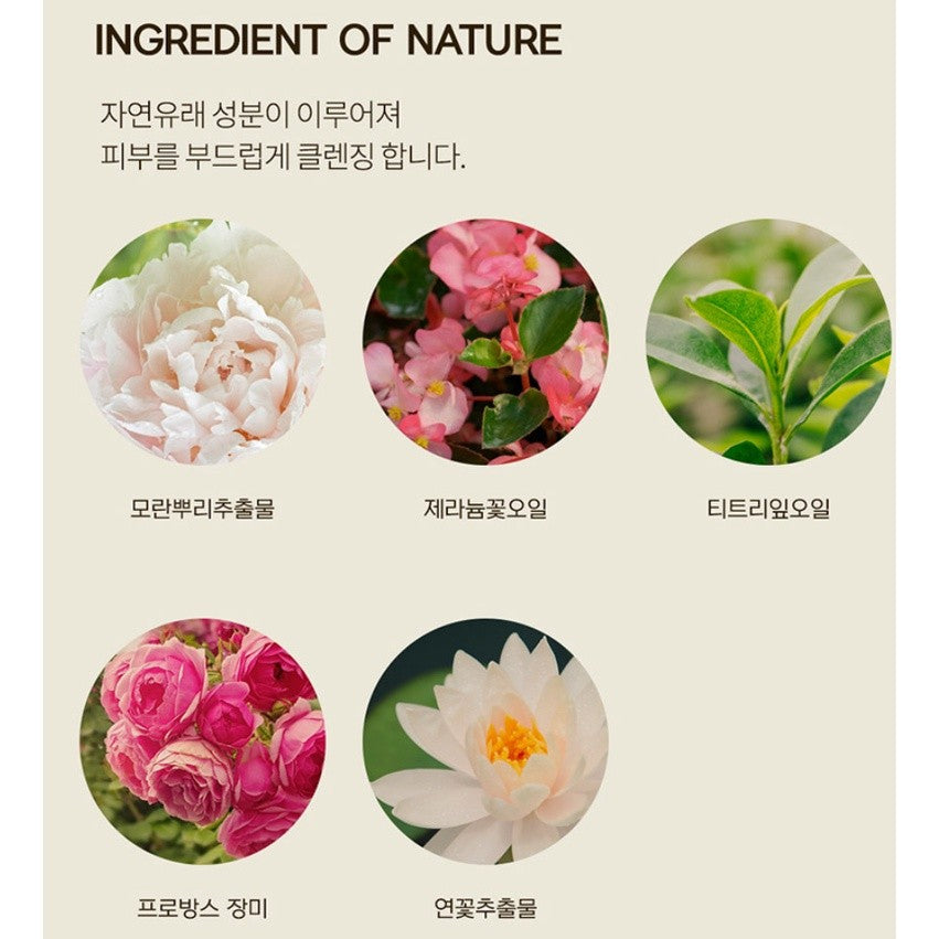 Purified water, glycerin, disodul cocoamphodiacetate, disodium lauroyl glutamate, sodul chloride, lauryl glucoside, butylene glycol, betaine, lotus extract, blue flag iris, edelweiss flower extract, lily madonna flower extract, common Jasmine flower extract, freesia extract, Provence rose flower extract, arrowroot extract, soap grass root extract, nettle extract, papaya extract, gentiana root extract, goldenrod extract, peony root extract, Spanish licorice root extract, Chrysanthemum fruit extract, pasqueflower extract. Usnia extract contains scented geranium flower oil, tea tree oil, panthenol, xanthan gum, citric acid, hexylene glycol, citroneol, geraniol, linalool.