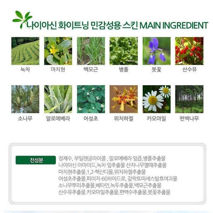 Purified water, butylene glycol, aloe vera leaf juice, centella asiatica extract, niacinamide, nouk tea leaf extract, sea buckthorn fruit extract, aloe vera extract. 1,2-Hexanediol, Witch Hazel Extract | Eoseongcho Extract PEG-60 Hydro, Galactomyces Ferment Filtrate Pine root extract, Betaine, Mung bean extract, White hair root extract Cornus extract, Chamomile extract, Cypress water extract. iris extract